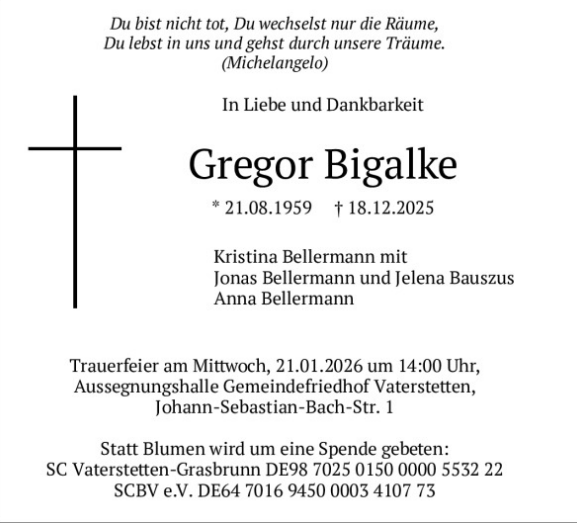 Die Beerdigung findet am 21.01.2026 um 14:00 Uhr in der Aussegnungshalle Gemeindefriedhof Vaterstetten (Johann-Sebastian-Bach-Straße 1) statt.