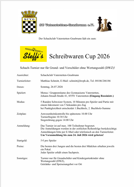 Steffi’s Schreibwaren Cup ist ideal für die Kinder als Einstieg geeignet! Es dürfen nur Kinder bis max. 4. Klasse mitspielen, die bisher noch keine Wertungszahl (DWZ) haben. Damit sorgen wir dafür, dass die Kinder Gegner in ihrem Alter und auf ihrem Spielniveau haben und das Spiele so auch Spaß macht!